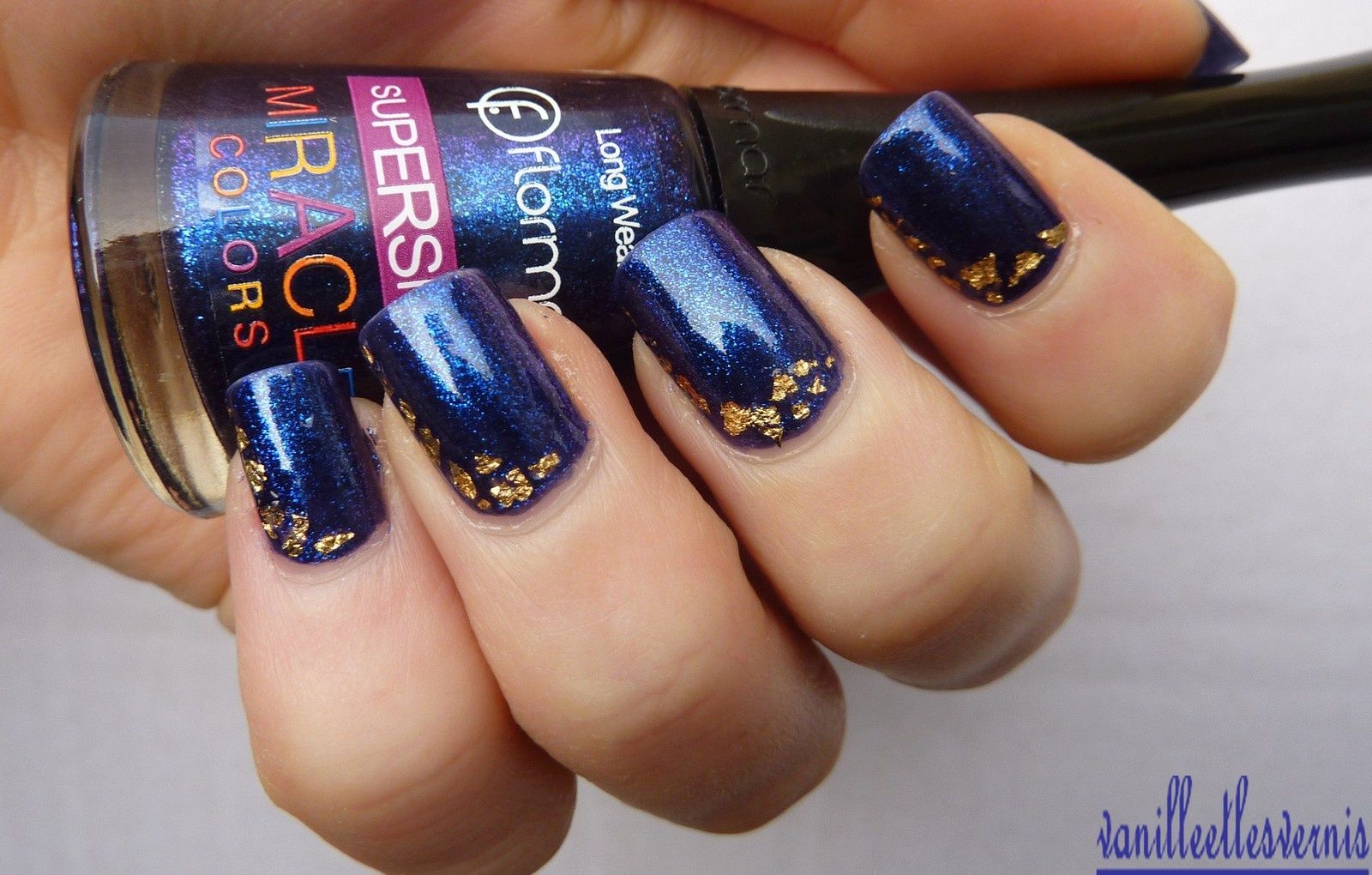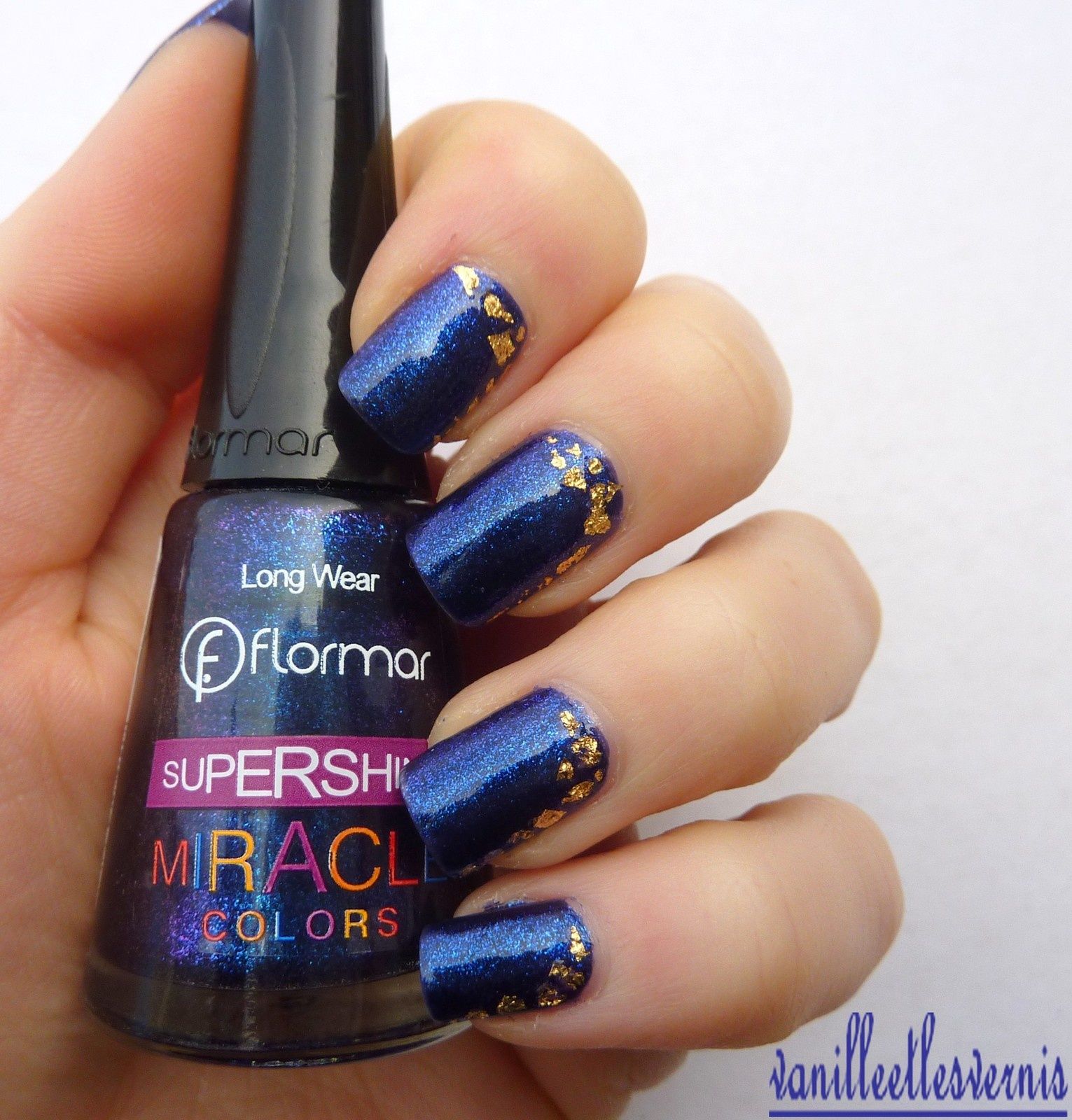 j'ai utilisé comme vernis de base, le Flormar Supershine U08 de chez Polishinail, il est superbe!!! c'est un violet trés foncé avec de superbes reflets bleus!! la couleur est top!! je l'ai posé en 2 couches, mais vous pouvez aussi le poser en une couche sur base noire