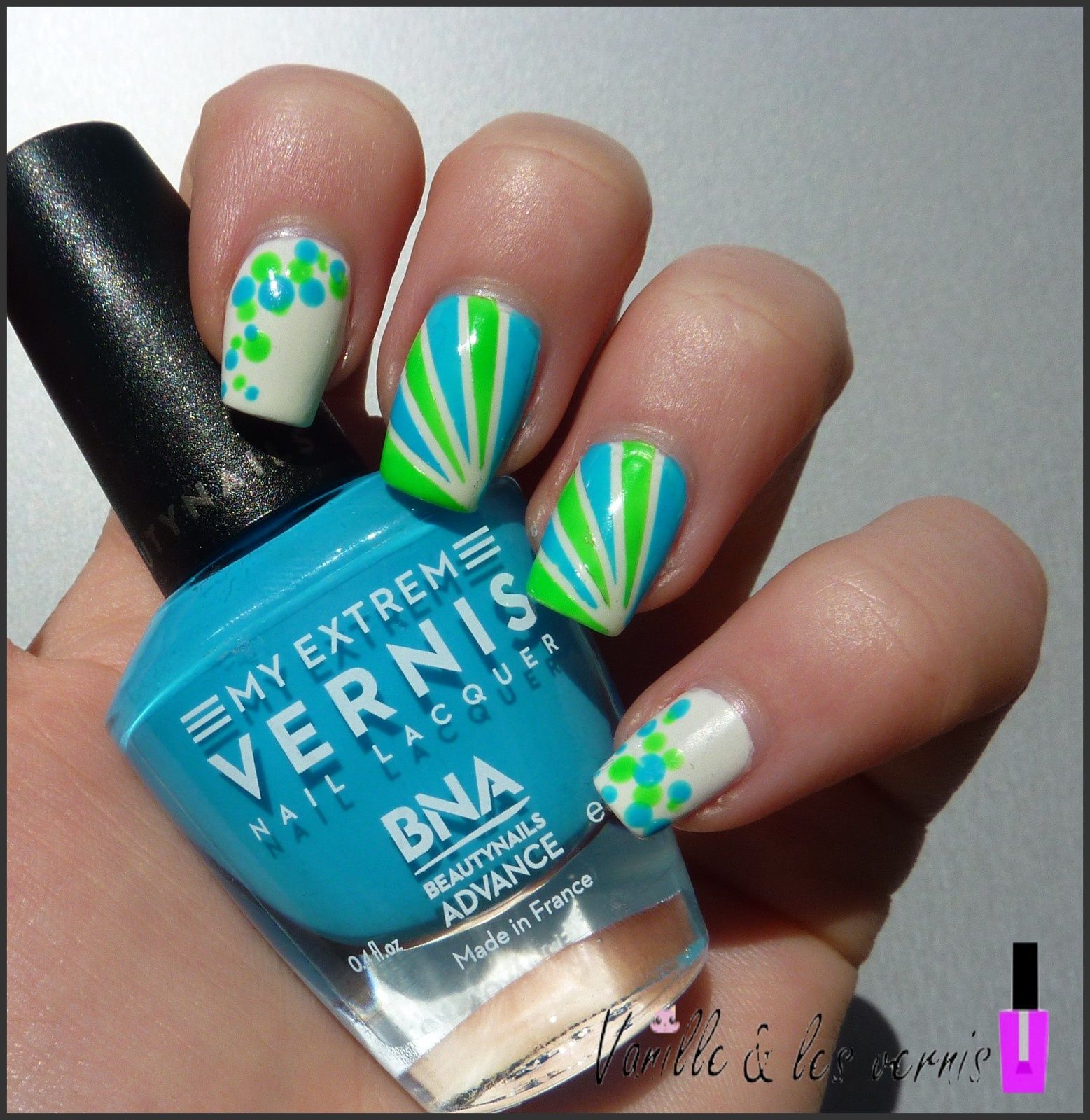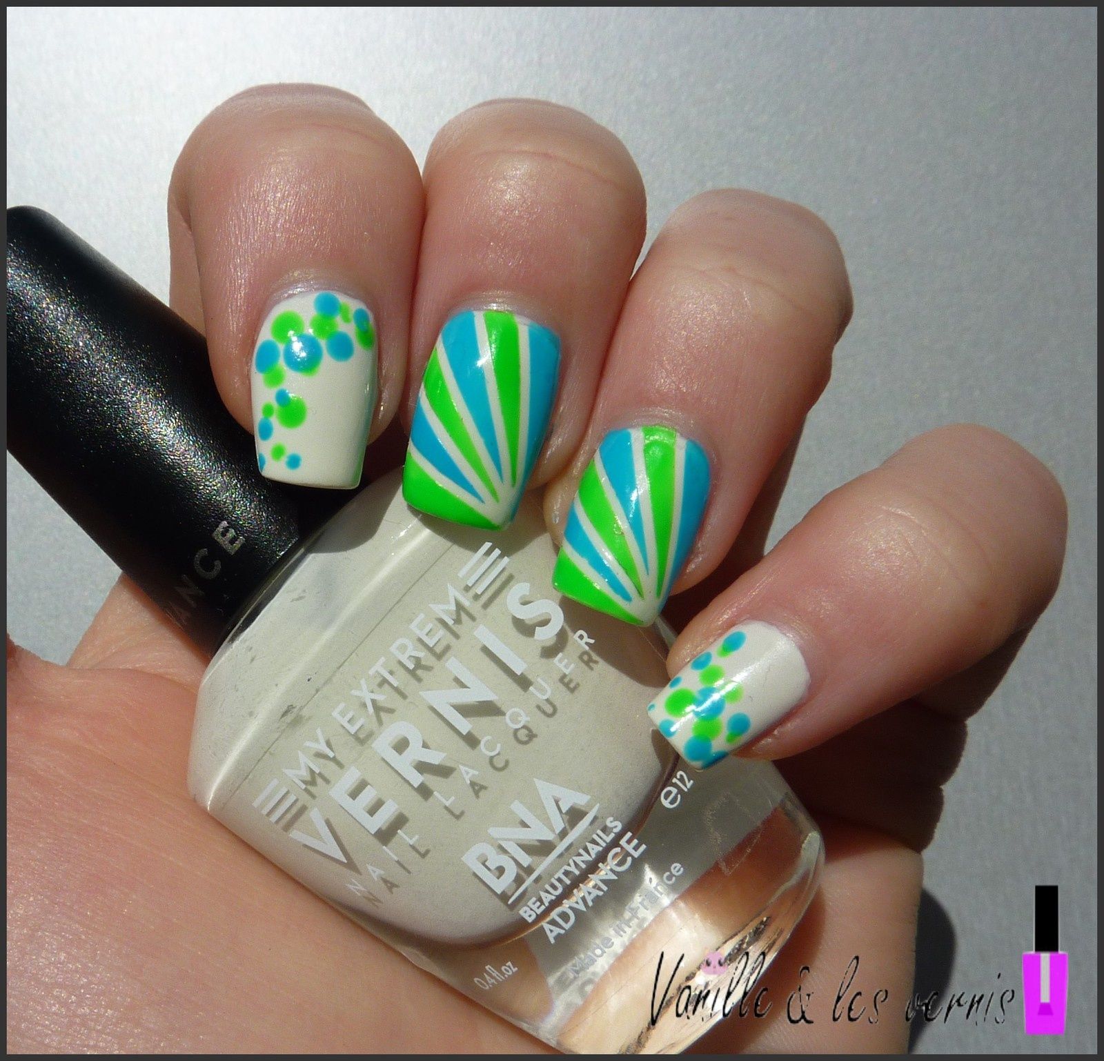 puis j'ai appliqué des morceaux des stripping tape en diagonale pour former une sorte d'éventail. j'ai ensuite remplis avec Green Fluo, il est terrible ce vert!!! quelle couleur!! vraiment il m'a scotché!!! je l'ai associé à Paradisco, un bleu clair, non fluo mais très joli lui aussi