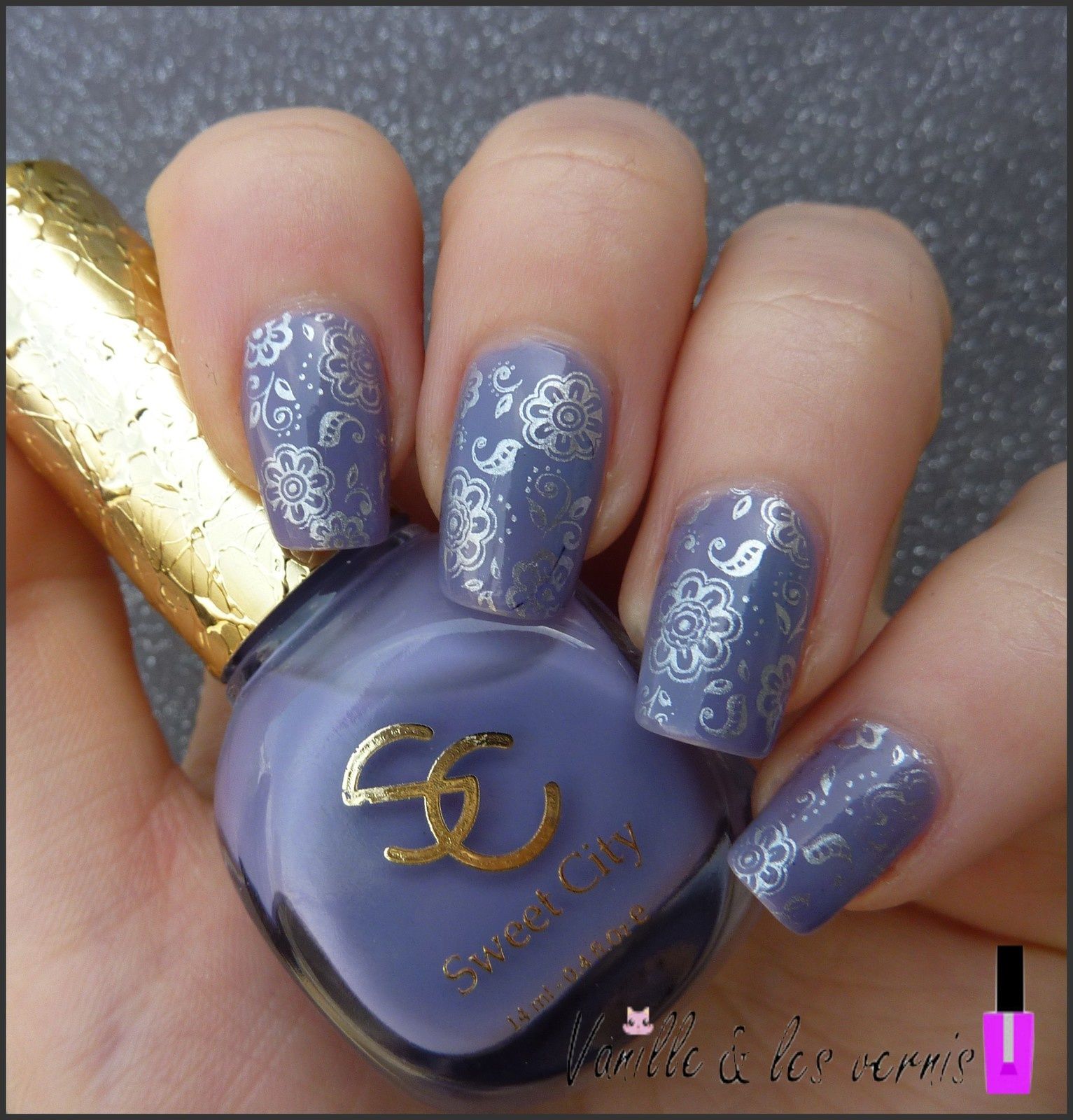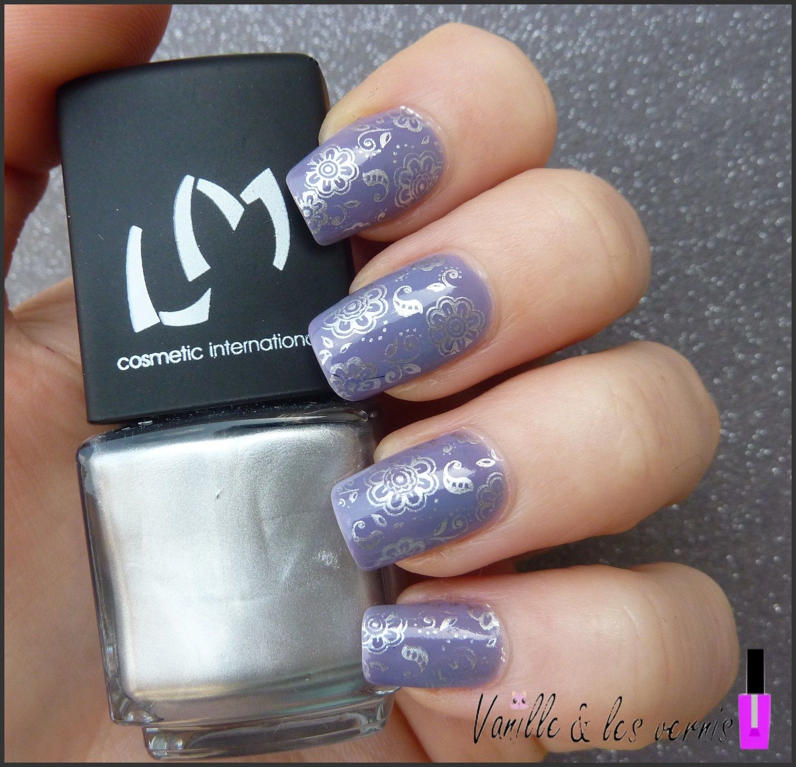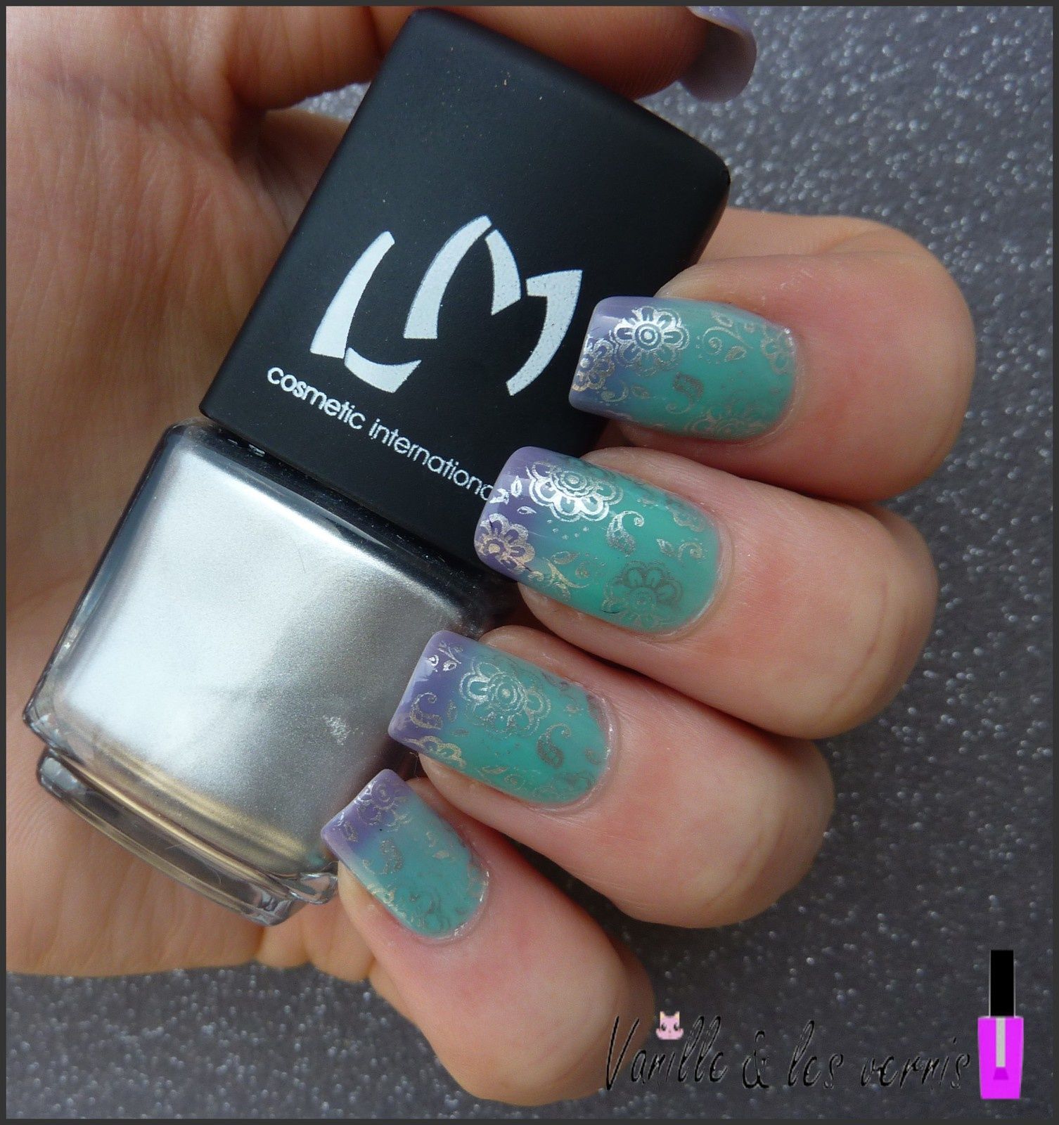 bref au bout de la 4éme couche j'ai arrêtée, regardée mes ongles un peu dépité (je trouvais pas le résultat pas folichon), et j'ai fais un stamping intégral en argenté manière de sauver les meubles (euh, ongles!)