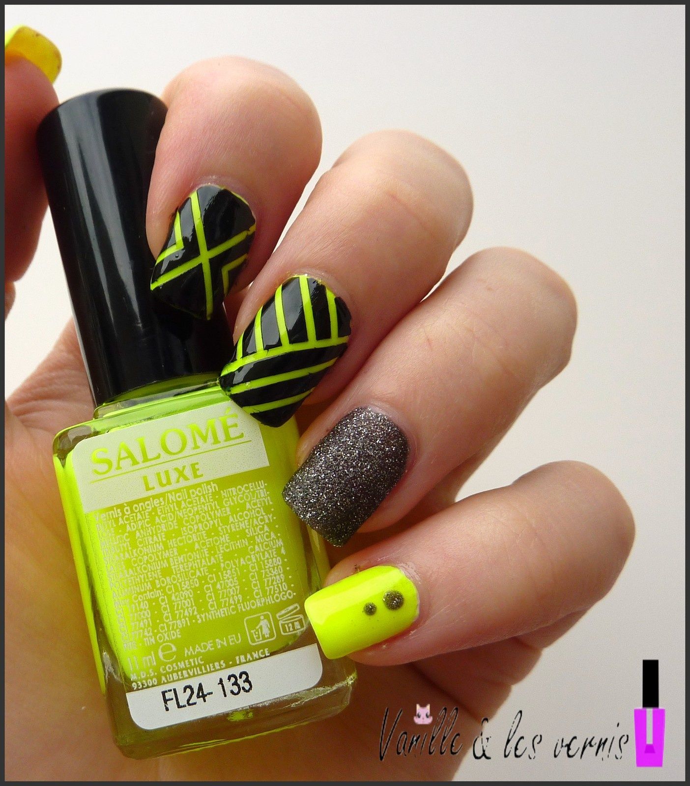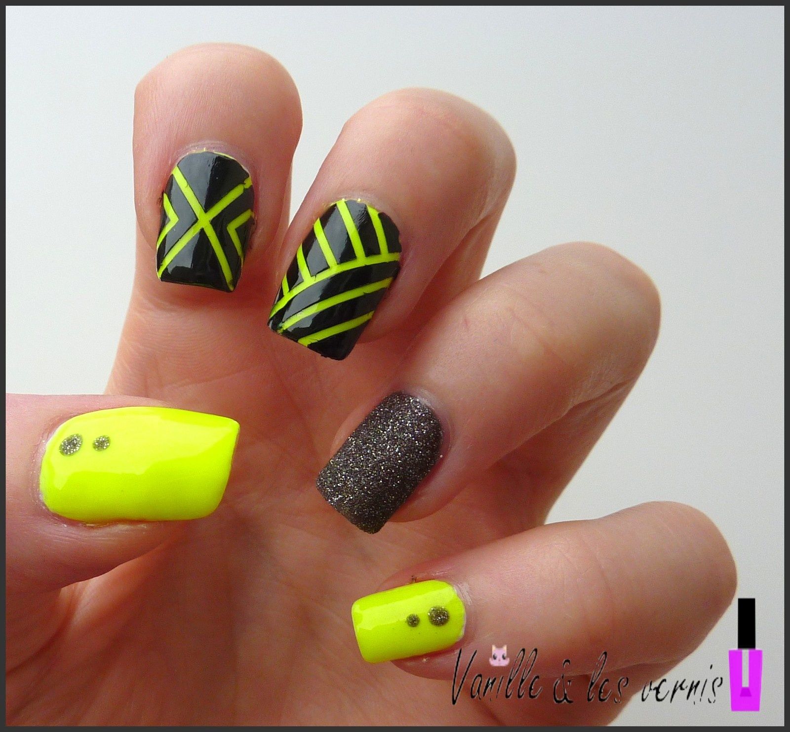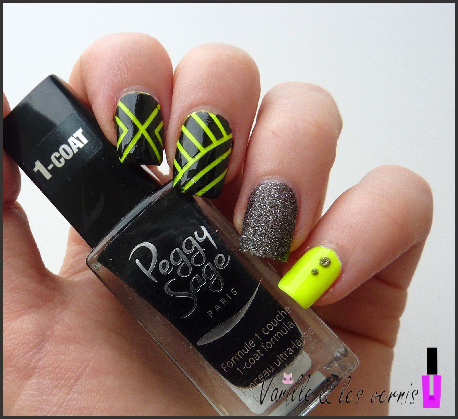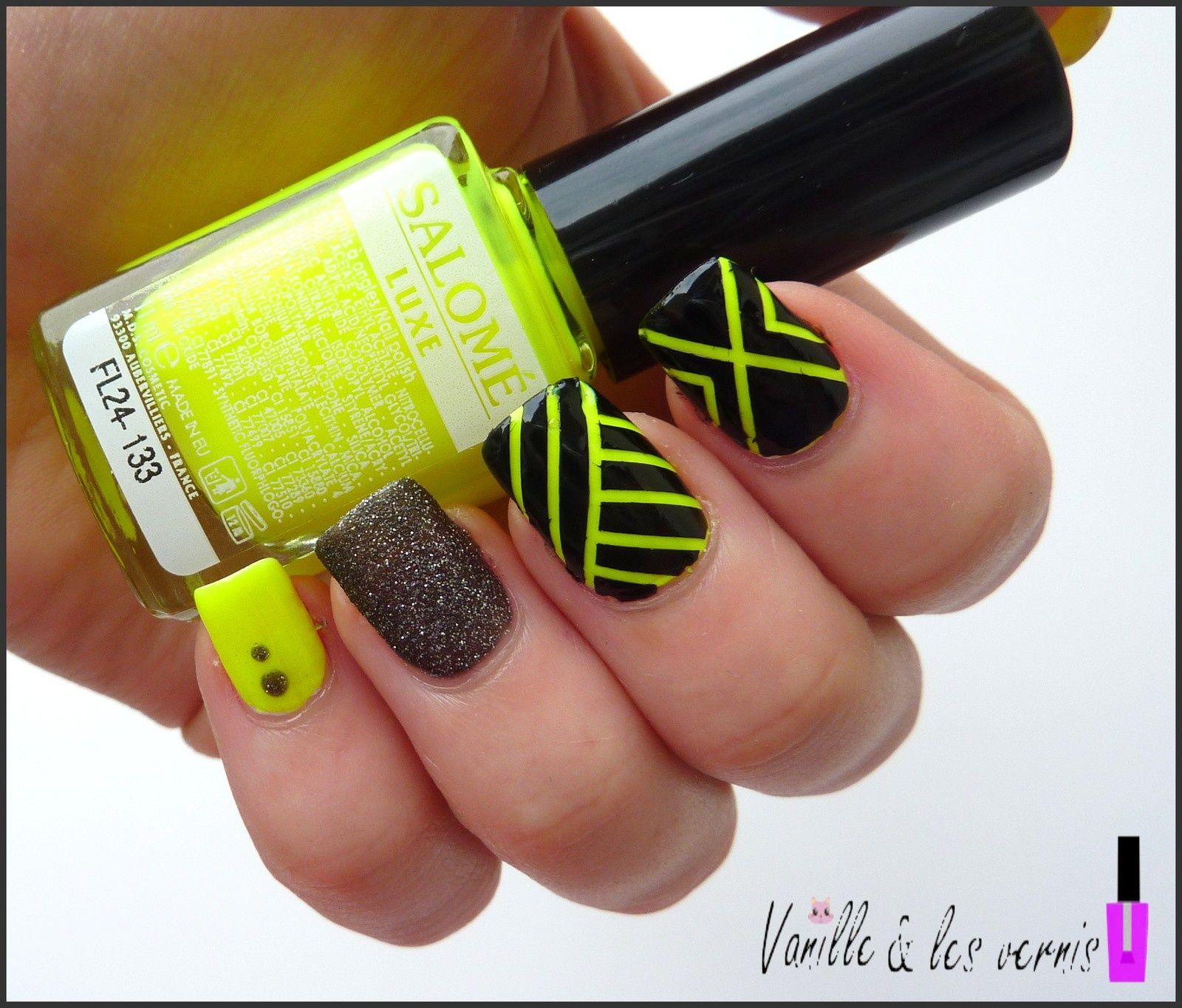 j'ai donc fais du stripping tape sur l'index et le majeur, recouvert d'une couche de noir Peggy Sage, et un accent nail avec un vernis texturé Holiday 60 de Golden Rose (trop fan de ses fines paillettes) et j'ai ajoutée 2 points de ce même vernis sur le jaune fluo du pouce et du petit au dotting tool