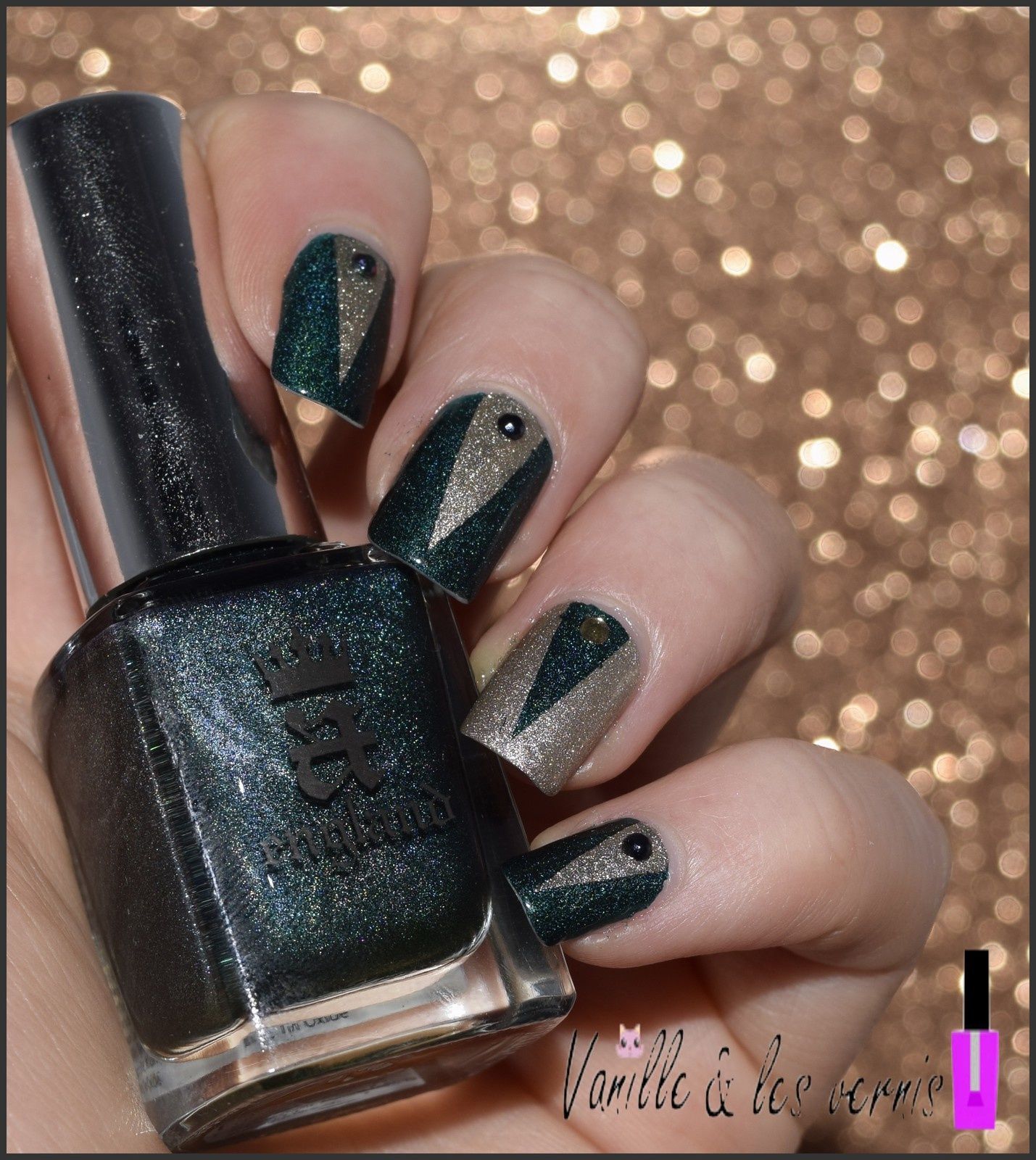 j'avais jetée mon dévolu sur le joli St Georges, de A England, un vert profond et intense holographique, avec cette texture si particulière à la marque. la pose comme toujours est un vrai plaisir, ca glisse tout seul, et il est tellement opaque que je l'ai posé en une seule couche!! bref, vous l'aurez compris un vrai régal!! sauf au niveau du dissolvage, non mais j'ai galéré! il est tellement pigmenté que tu t'en mets partout! heureusement que j'avais mis qu'une couche!!!