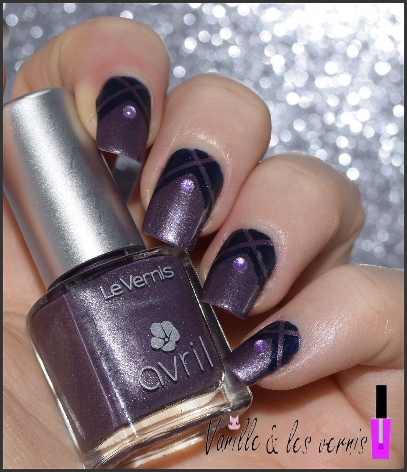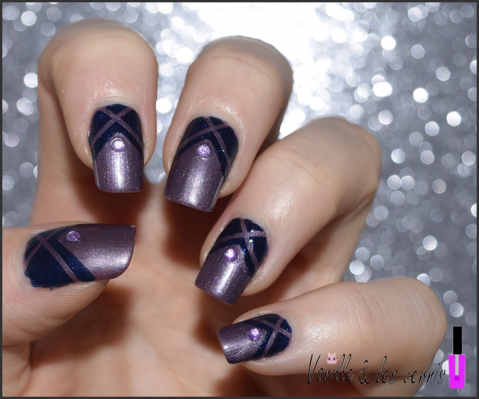 j'ai commencé par poser Figue Nacré, qui comme son nom l'indique est un trés joli violet satiné, il s’applique facilement, malgré le fait que le pinceau soit tout petit! en même temps, normal les vernis ne font que 7ml. mais la finition est top, pas de vilaines traces de pinceaux!, j'ai ensuite placé du stripping tape (mon pote^^) en haut de l'ongle et croisé, puis j'ai appliqué Mille et une Nuits pailleté. ce vernis est juste trop beau!! surtout dans le flacon.... j'ai pas réussi à retrouver les reflets violets du flacon! mais sniiif!!