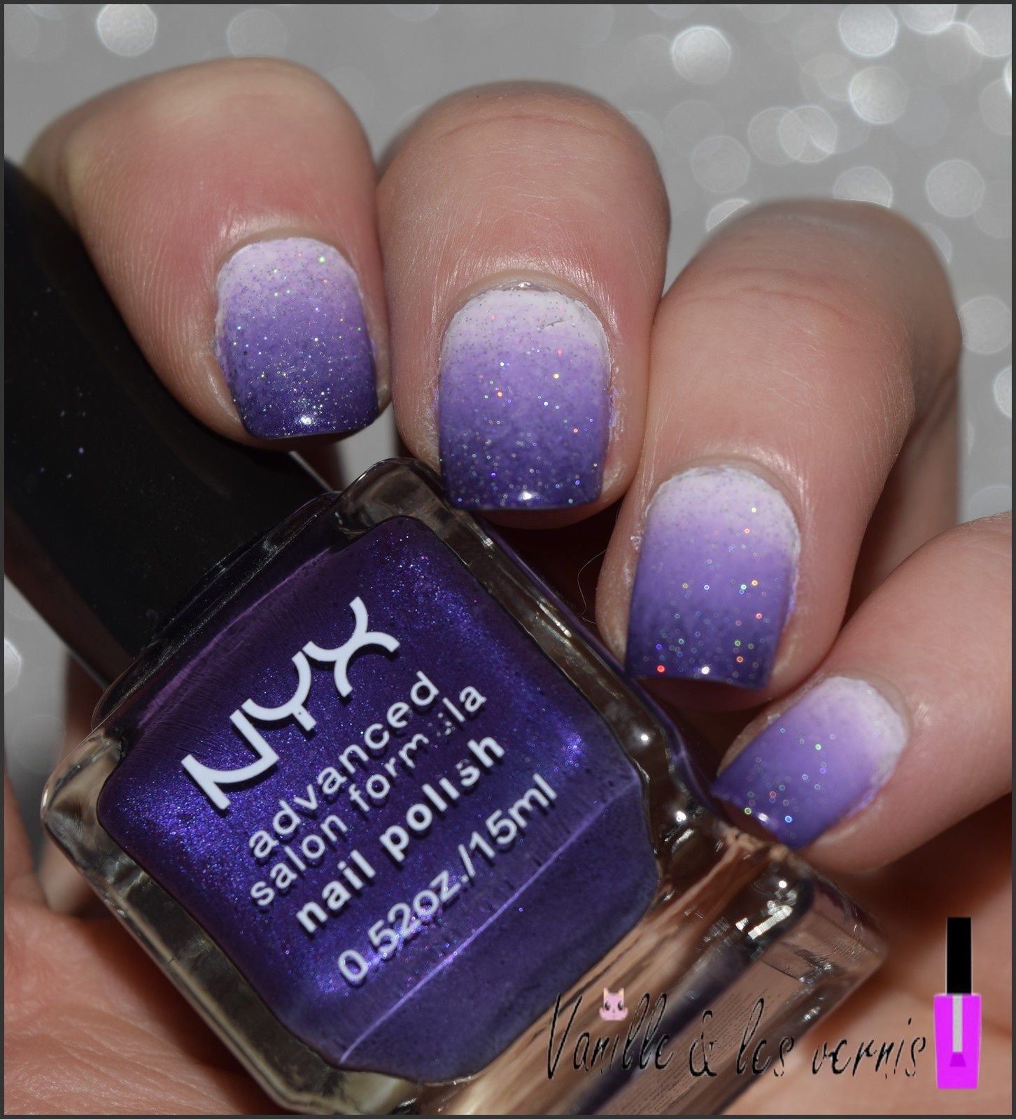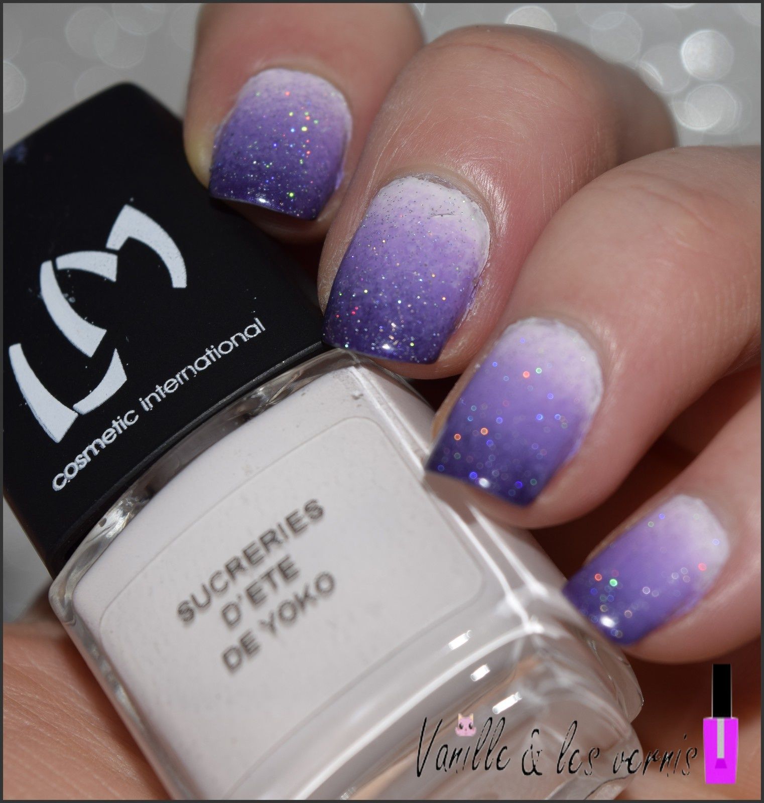 j'ai sortie encore une fois, 3 vernis que j'adore assembler : Chamallow de LM Cosmetic, un rose crème tout doux (par contre je n'aime pas du tout son application) je m'en suis servie en base pour ce nail art car il est tellement clair, presque blanc, que c'était l'idéal. puis avec une éponge, j'ai dégradé ce rose doux, avec le N°331 de Kiko un violet tendre et un vernis violet foncé Dark Purple de Nyx.
