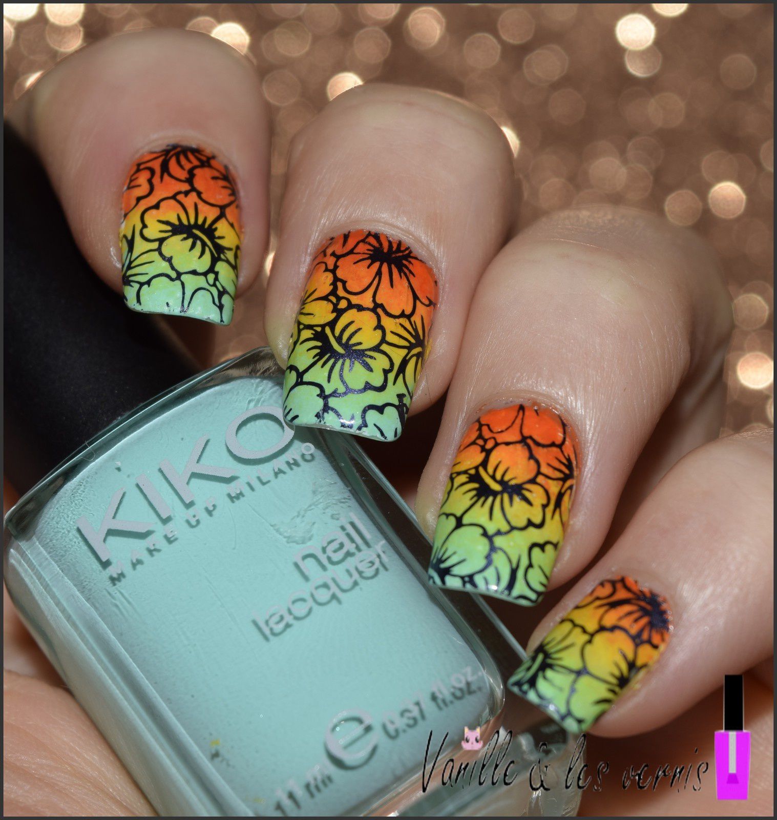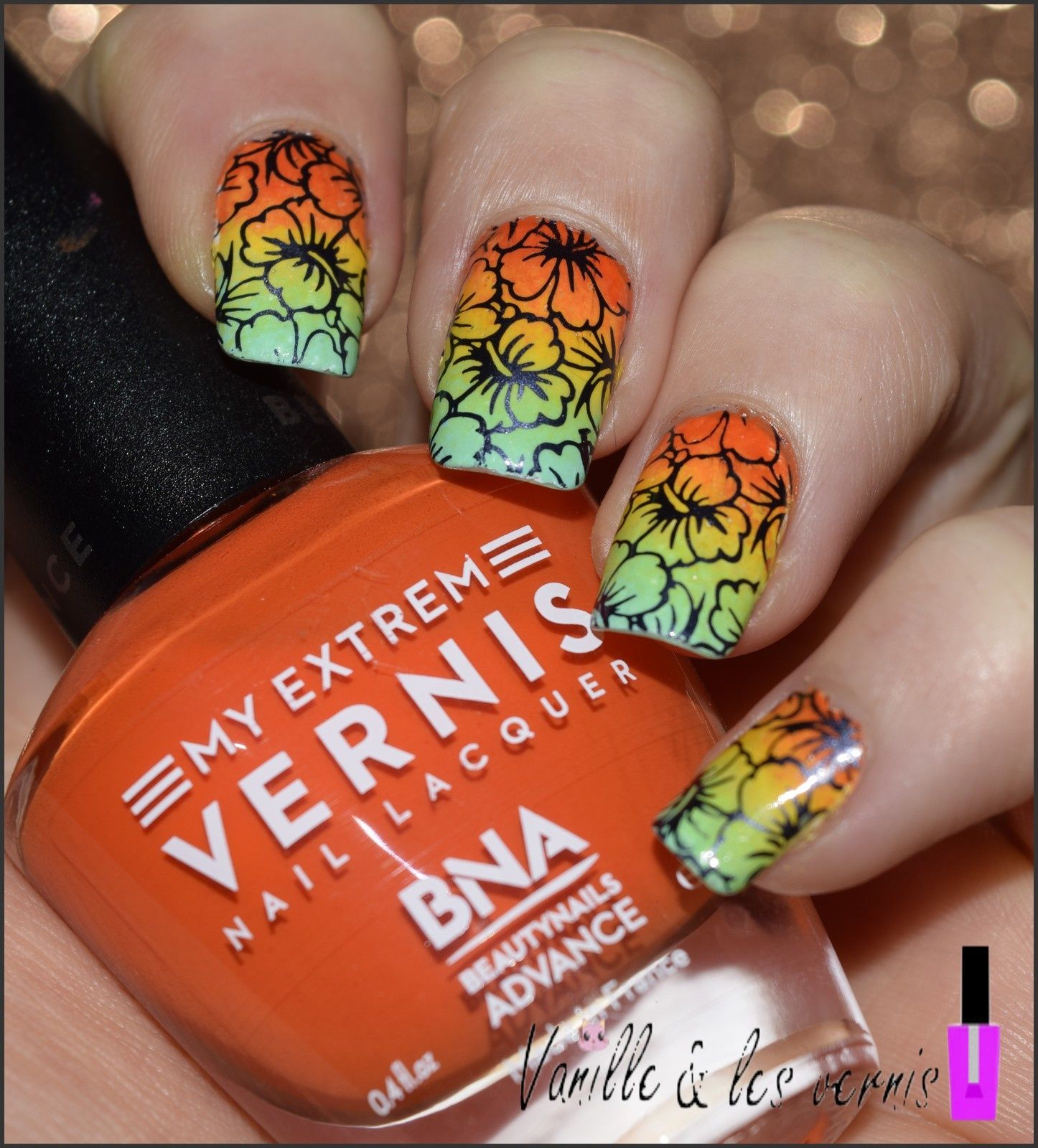 pour le stamping, j'ai voulu faire des fleurs, j'avais aucune inspi jusqu'à que je tombe sur ma plaque BPL029 de chez Née Jolie, et j'ai directement flashé sur les hibiscus *-* ne me demandez pas pourquoi!! ;) j'ai stampé tout ca avec mon Shake It Up de Essie, pour un petit coté métallisé