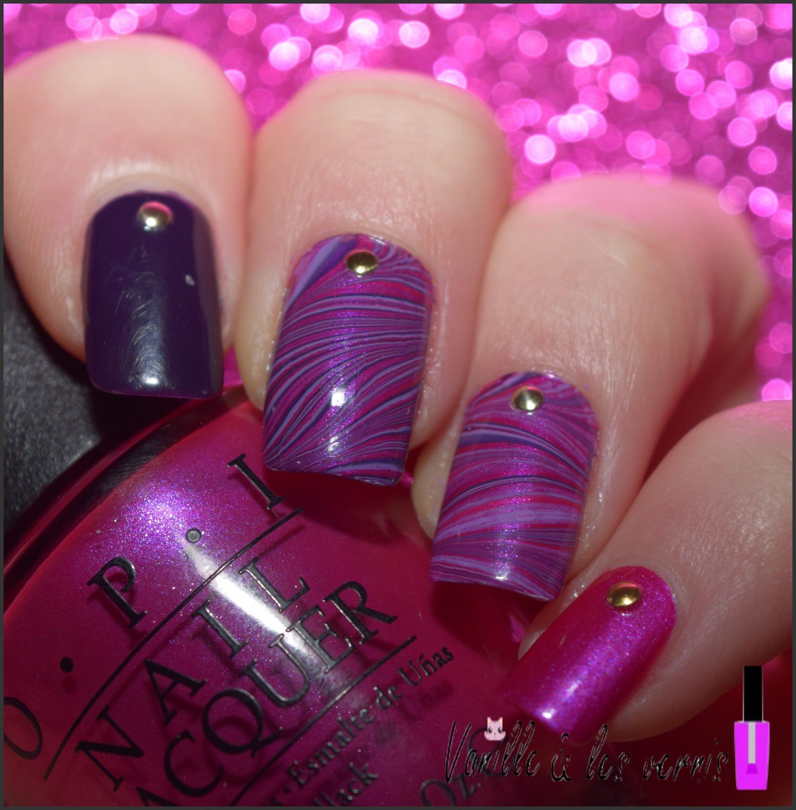 je termine avec ce water marble, tout en jolis vernis que m'a offert mon adorable Kanails pour mon anniversaire!!! on a Do You Lilac It, un violet trés doux, Viking in a Vinter Vonderland (non mais c'est quoi ces noms??!) un violet trés intense, et Flashbulb Fushia un rose flashy irisé, tous 3 des Opi!! comme toujours avec cette marque, une pigmentation top, et un pinceau qui me va vraiment bien!!