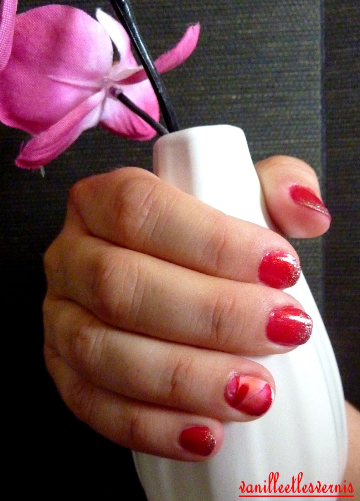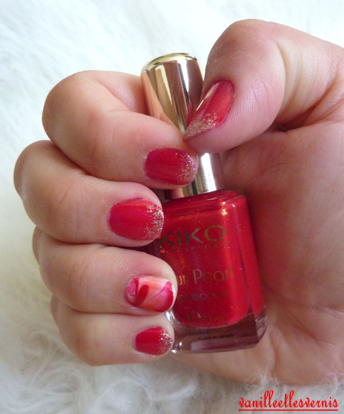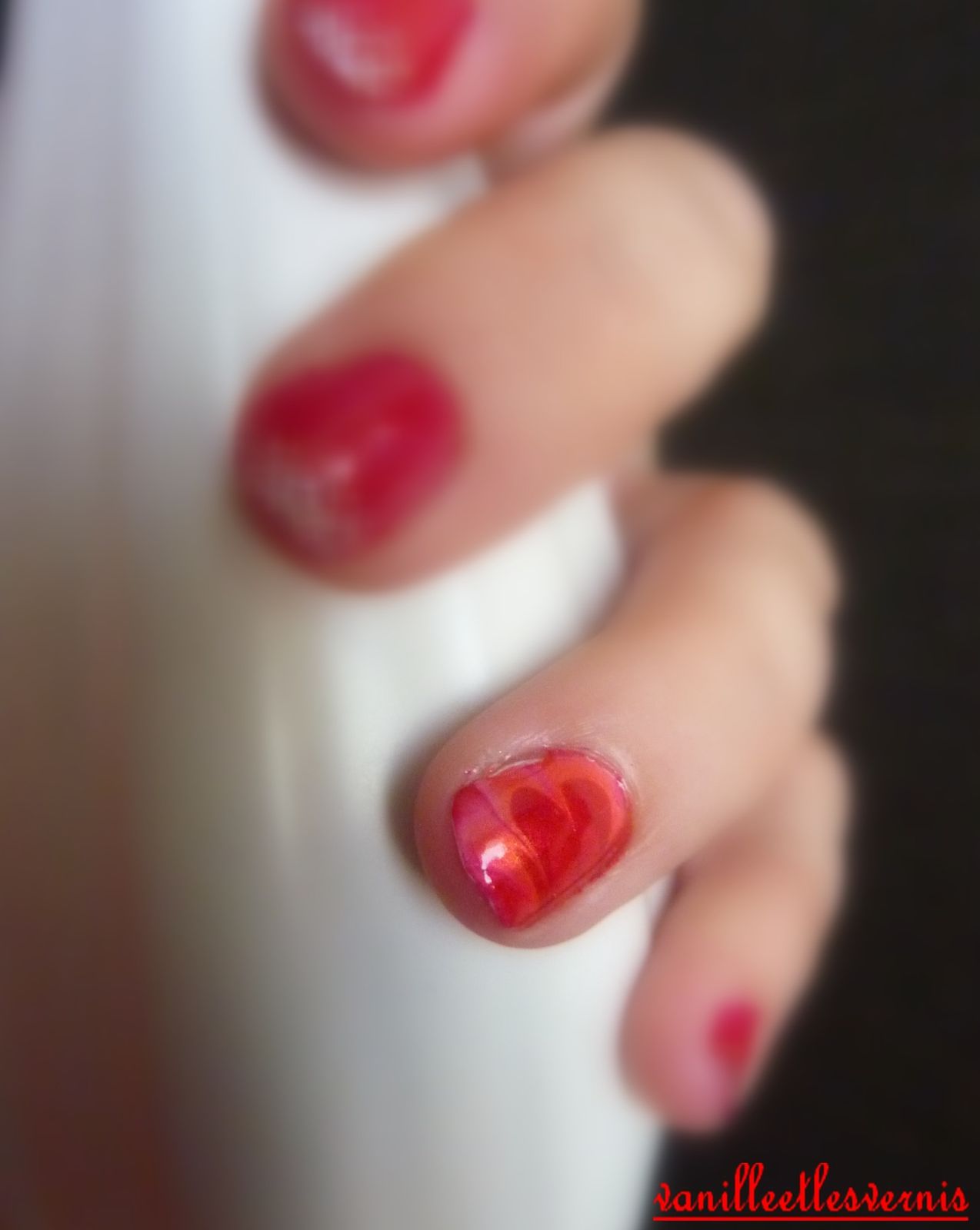 j'ai décidé de ne faire le Water Marble que en accent nail. j'ai utilisé : un beige clair de chez Yves Rocher, un Kiko rouge et un corail, bien sur j'ai complétement zappé de prendre les ref!! :'(
